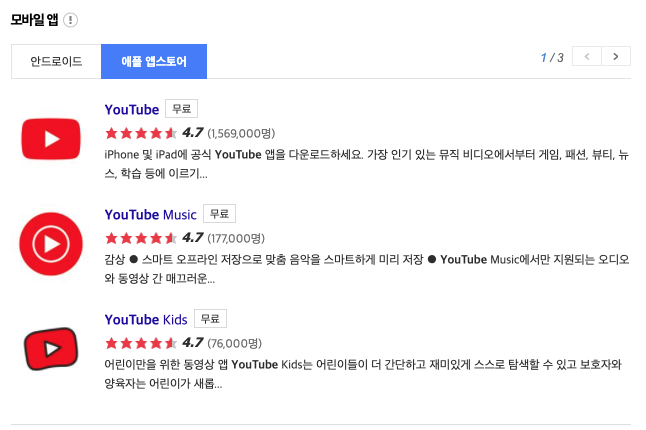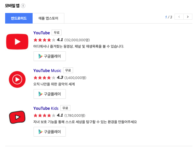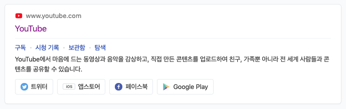 유튜브는 PC 외에 스마트폰, 패드에서도 사용할 수 있죠. 어플을 활용하면 편리하게 진입이 가능한데요. 다음과 네이버에 유튜브를 검색해보니 아래와 같이 설명이 되어있습니다. 다음에선 조금더 간략한 설명이 제공되고 있네요. 웹사이트 설명란이 조금더 크고, 메타구간이 길었으며 좋겠다라는 생각이 듭니다.