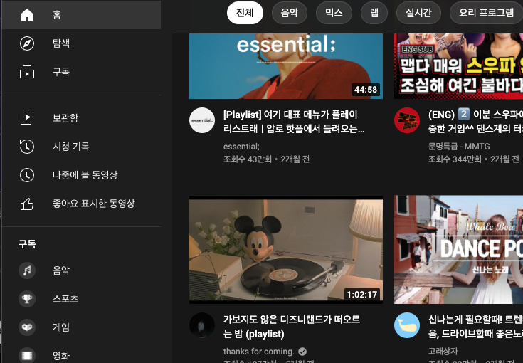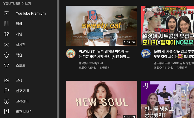 유튜브 사이트 좌측에는 메뉴가 있는데요. 평소 내가 즐겨 보기 위해 구독을 눌러놓았던 리스트를 확인할 수 있습니다. 혹은 구독하지는 않았지만 관련 카테고리를 보고 싶다면 영화, 게임, 실시간, 학습, 스포츠 같은 케테고리를 선택해서 골라볼수도 있죠.